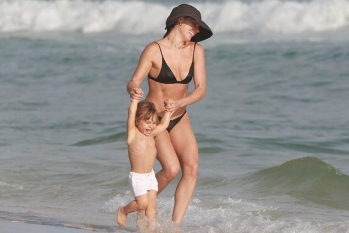 O menino é fruto do relacionamento da atriz, que interpreta Betina em ‘Amor de Mãe‘, com o modelo André Resende. Usando biquíni preto e chapéu, além de brincar com o menino, ela conseguiu colocar o alongamento em dia na beira do mar.
