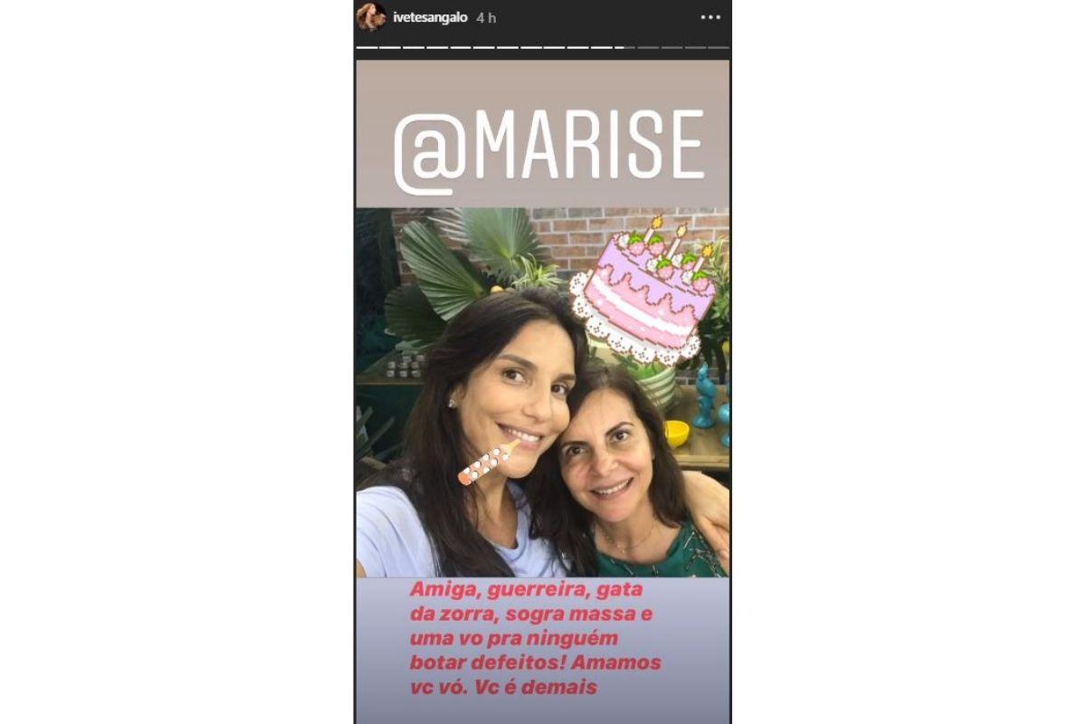 Na legenda da foto, postada pelo Instagram Stories, Ivete escreveu: “Amiga, guerreira, gata da zorra, sogra massa e uma vó pra ninguém botar defeitos! Amamos você vó! Você é demais!”. A filha de Marise, Miss Cady, também deixou um recado para a mãe: “Coragem, garra e bondade são características suas que peguei para mim! Aprendi muito pequenininha observando você minha mãe. E sou muito grata a você por tantos aprendizados e por sempre, sempre esta ao meu lado me apoiando nas minhas maiores loucuras!!! Nesse aniversário, te desejo uma saúde perfeita, para que a gente possa colecionar muitos outros momentos mágicos juntinhas!! Te amo infinito”.