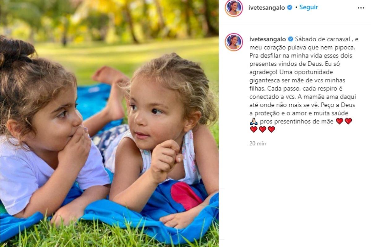 A cantora aproveitou o clique para falar sobre uma data especial na sua carreira: o Carnaval. Veveta lembrou que comandou um trio elétrico estando grávida das duas pequenas.“Sábado de carnaval , e meu coração pulava que nem pipoca. Pra desfilar na minha vida esses dois presentes vindos de Deus. Eu só agradeço!”, escreveu ela na legenda da publicação.