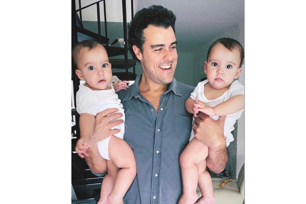 Nesta terça-feira, 28, o ator Joaquim Lopes compartilhou um clique ao lado das filhas gêmeas Pietra e Sofia, de 09 meses. Nas fotos, o pai de primeira viagem está bem sorridente com as gêmeas nos braços e elas vestidas com o mesmo macacão.
