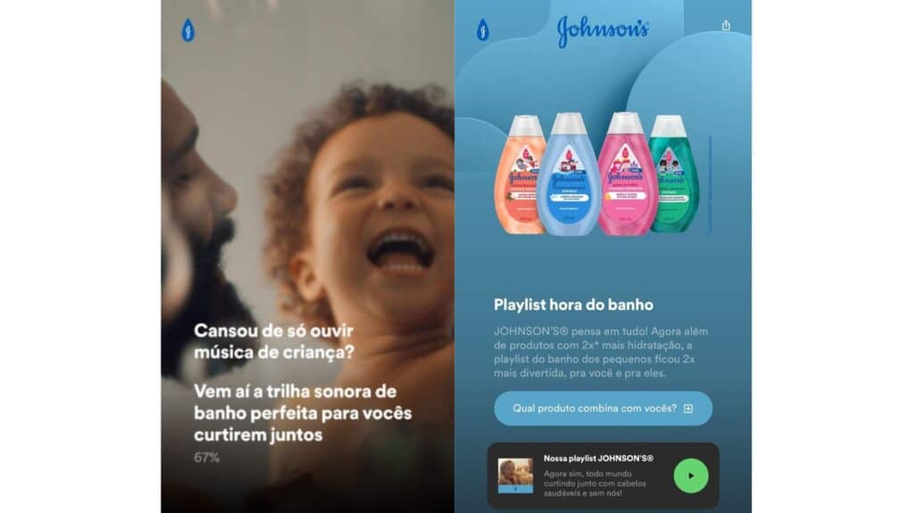 A experiência é super interativa e já está no ar no Spotify para celulares. Primeiro, você responde algumas perguntas sobre seus hábitos musicais. Depois, JOHNSON’S® Baby e Spotify criam uma playlist sob medida para a sua família. É música para curtir juntos e transformar o banho em um show de diversão!