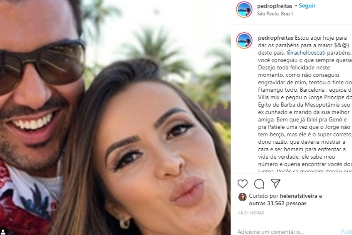 O ex-cunhado publicou uma foto do cantor ao lado da nova namorada e explicou a situação: “Parabéns Rachel, você conseguiu o que sempre queria. Desejo toda felicidade neste momento. Como não conseguiu engravidar de mim, tentou todo o time do Flamengo, Barcelona, equipe do ‘Villa Mix’ e pegou o ‘Jorge príncipe do Egito de barba da Mesopotamia’”, ironizou Pedro.