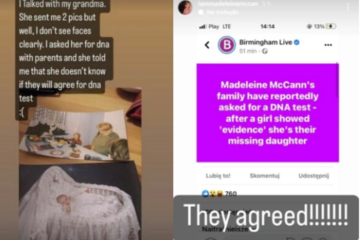 Em suas redes sociais – criada para chamar a atenção da mídia e “provar” que era a criança desaparecida –, Julia Faustyna mostrou novas fotos de quando ainda era bebê e afirmou que os pais de Madeleine, Kate e Gerry McCann, aceitaram fazer um teste de DNA para tentar resolver o caso.