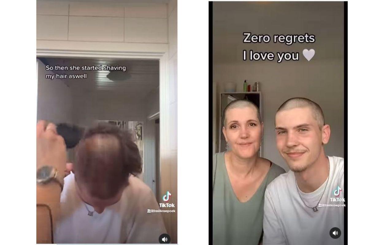 Na legenda do vídeo ele escreve: “Minha mãe teve que raspar a cabeça devido a quimioterapia, mas eu não queria que ela se sentisse sozinha, então ela começou a raspar meu cabelo também. Sem arrependimento, amo você”