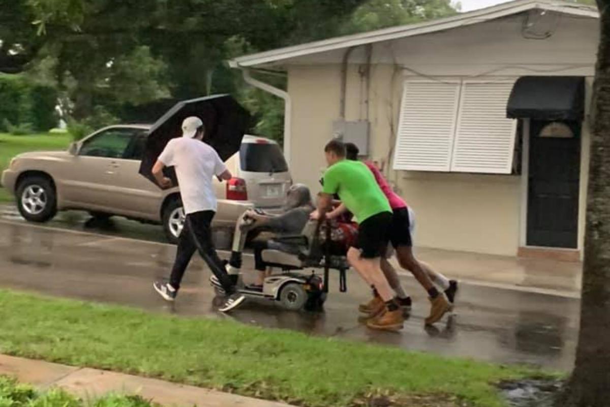 Quatro jovens americanos foram fotografados empurrando uma scooter elétrica de uma idosa, que acabou estragando por conta de uma tempestade. O caso aconteceu na Flórida, nos Estados Unidos, e foi Katty Castro que viu a cena e decidiu registrar para compartilhar a boa ação com os amigos.