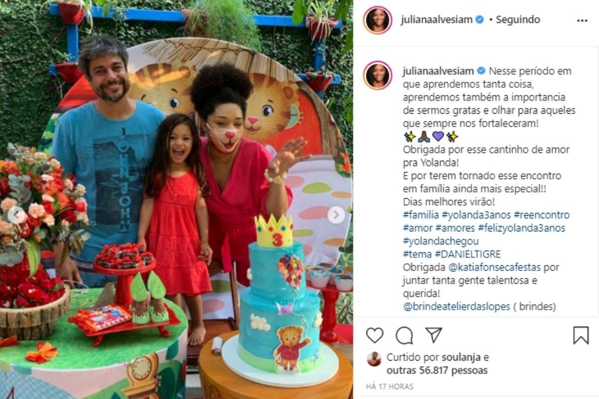 A atriz Juliana Alves usou as redes sociais para compartilhar alguns detalhes da decoração da festa de 3 anos que fez para a filha, Yolanda. A garota completou 3 anos na última segunda-feira, 21 de setembro, mas as fotos da festa foram compartilhadas pela famosa nesta segunda-feira, 28 de setembro. Junto com as imagens, ela fez uma reflexão sobre o tempo que estamos passando e a importância da família.