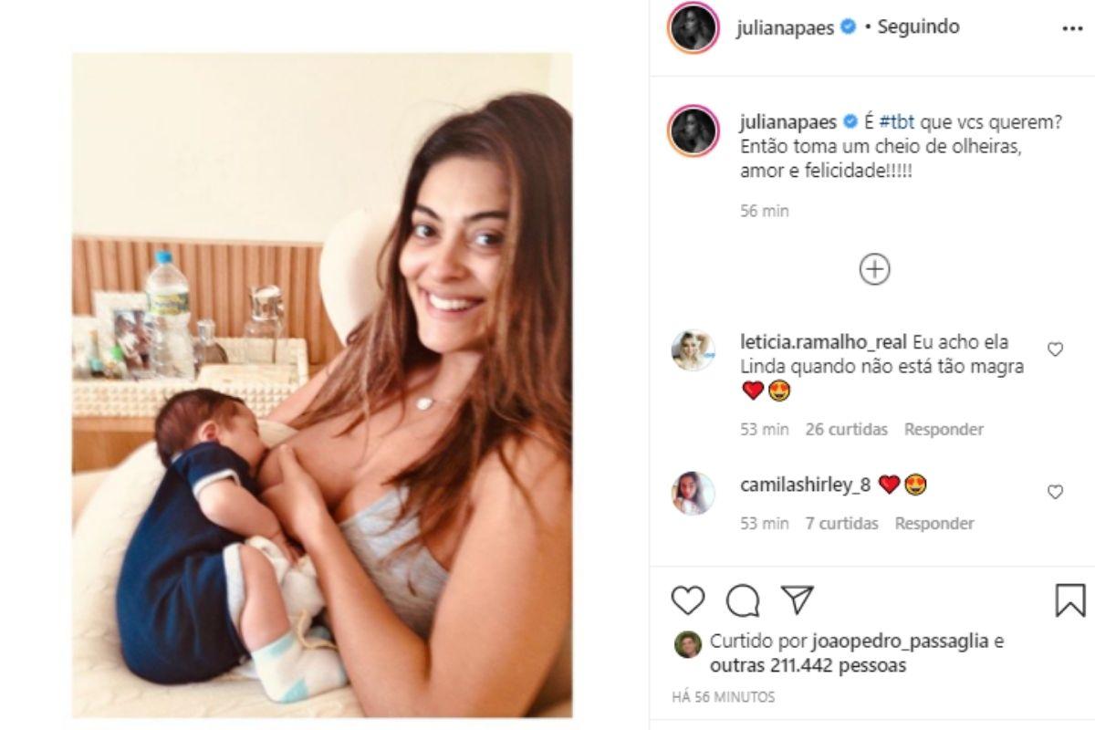Na foto, Juliana parece olhando sorridente para a câmera enquanto o bebê está sendo amamentado. Na legenda, a mãe brincou com a hashtag #tbt, que incentiva os usuários a publicarem imagens antigas. “É #tbt que vcs querem? Então toma um cheio de olheiras, amor e felicidade!!!!!”, escreveu ela.