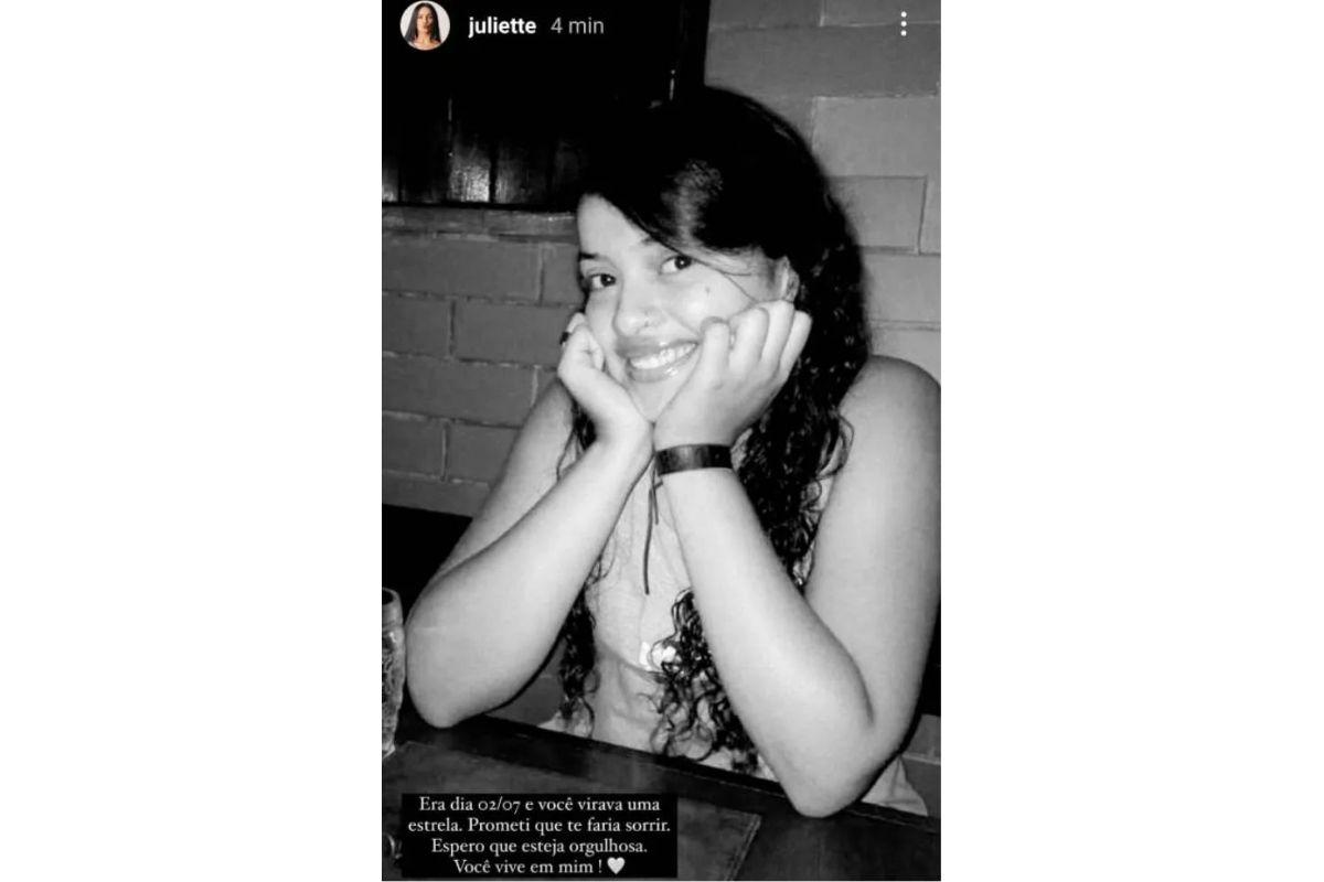Por meio dos Stories do Instagram, Juliette relembrou a perda e aproveitou para fazer uma homenagem à irmã. A advogada e influenciadora fala com frequência da ligação que as duas tinham e do quão difícil foi a perda.
