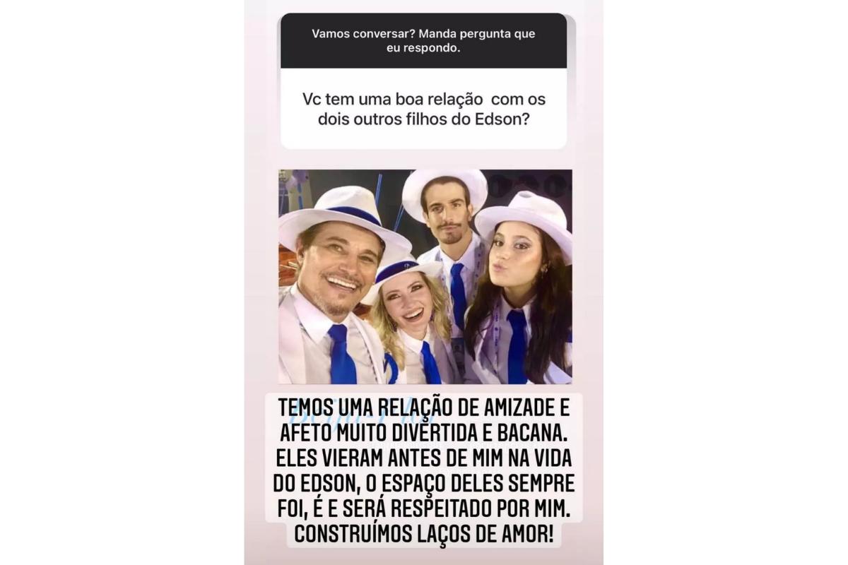 “Temos uma relação de amizade e afeto muito divertida e bacana. Eles vieram antes de mim na vida do Edson. O espaço deles sempre foi, é e será respeitado por mim. Construímos um laço de amor”, afirmou a atriz que, em seguida, falou sobre a reação dos filhos do ator com a novidade da gravidez, que já está na reta final.