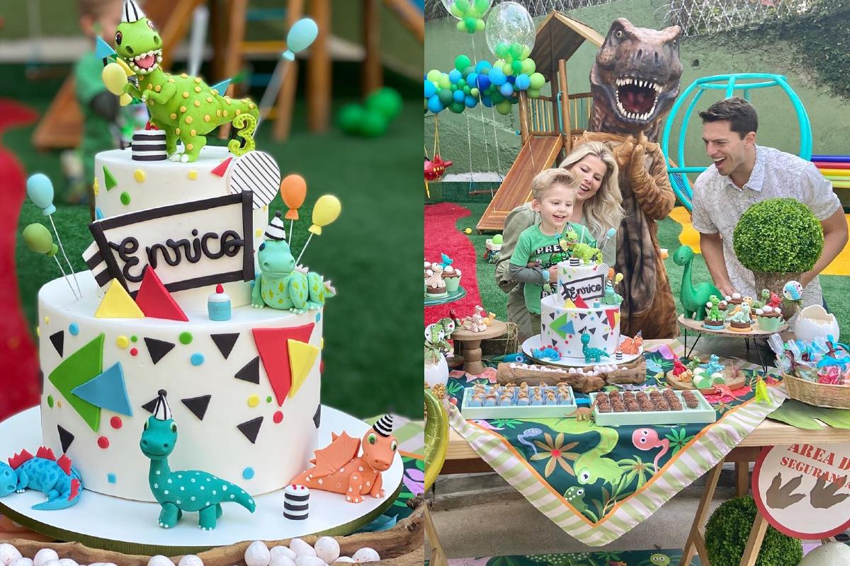 Karina Bacchi publicou no Instagram fotos da comemoração de aniversário do filho Enrico. O menino completou três anos e escolheu como tema da festa “Picnic T-rex”, literalmente colocando dinossauros para aproveitarem um piquenique.