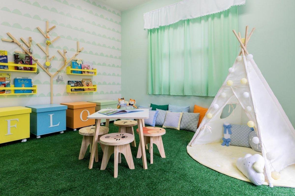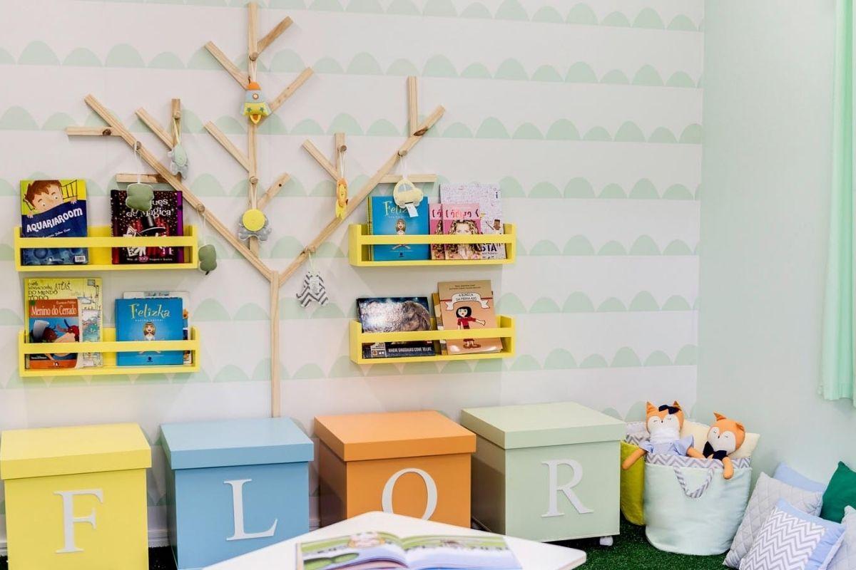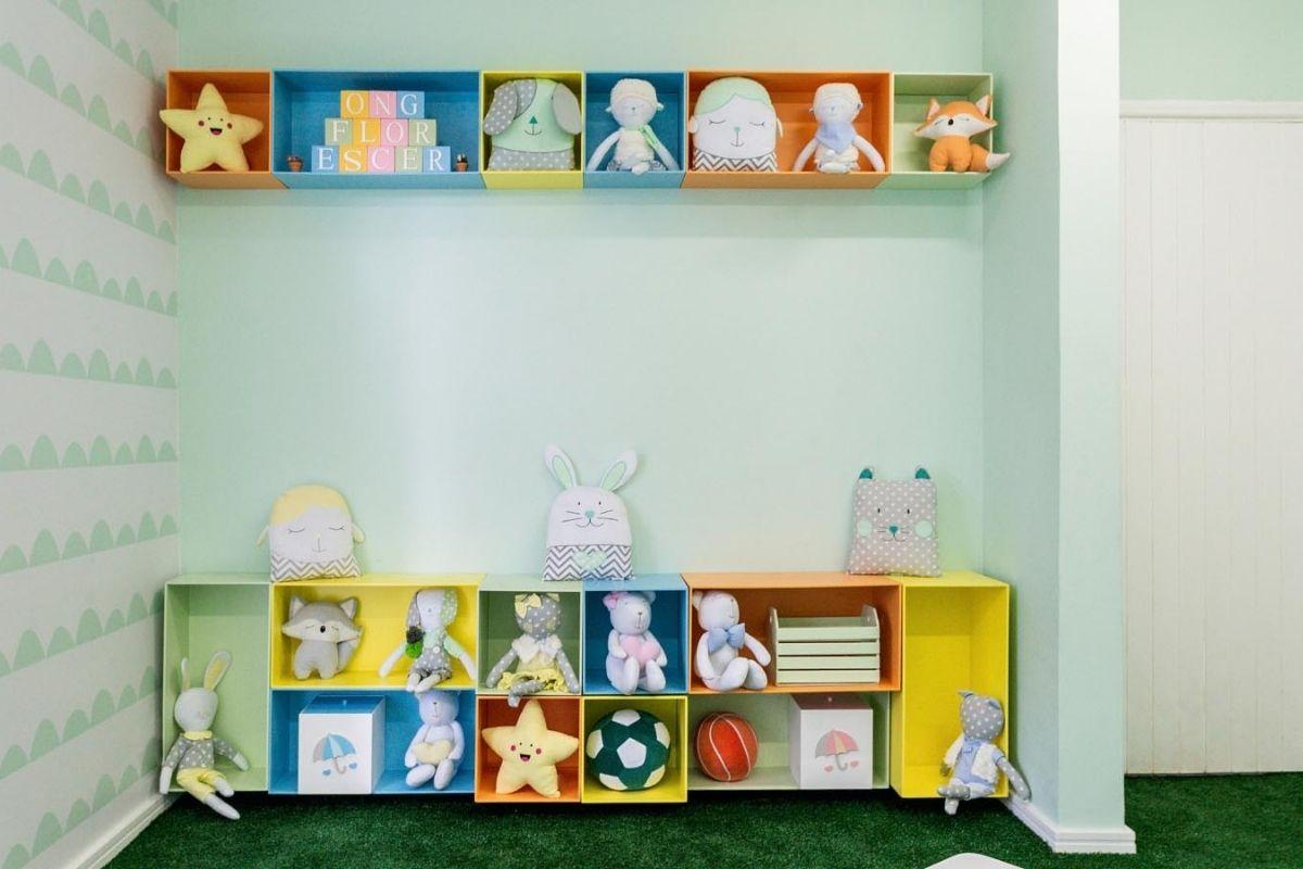 Já a brinquedoteca conta com uma atmosfera lúdica, para ser um espaço de brincadeiras e leitura. A decoração conta com uma cabana, o charmoso cabideiro-árvore e muitos nichos coloridos, além disso o local é cheio de bichos de pelúcia, bonecos de pano e almofadas, assim, as crianças podem se divertir em um lugar aconchegante.