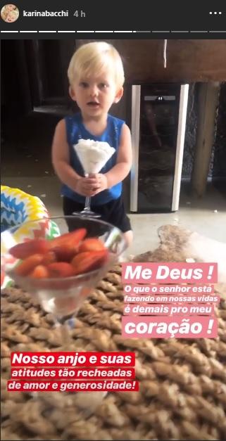 Nas histórias seguintes, o menino aparece trazendo uma taça de chantili para a mãe, que estava comendo morango, e da um lindo sorriso que deixou a Karina e todos nós derretidos! Ela tem 5,4 milhões de seguidores em seu Instagram e na última foto postada ela recebeu vários comentários com “A família mais linda do mundo!” Nós concordamos! Veja os momentos!
