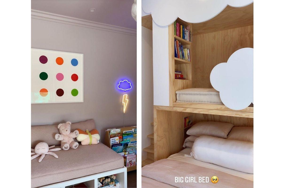 Para incrementar o ambiente, é possível ver recortes de nuvem, que ficam presos na parte superior da cama. Na imagem, Kylie se mostrou bastante orgulhosa da filha e até chegou a escrever: “Cama de menina grande”.