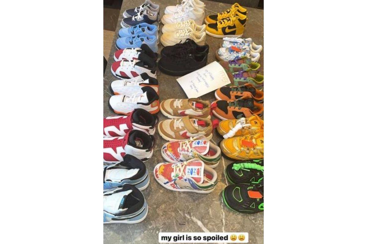 Nos stories do Instagram, a mãe famosa mostrou os sapatos que ela ganhou. Na imagem, é possível ver 17 tênis de todos os estilos: coloridos, neutros, de cano alto e baixo. Junto com a imagem, Kylie Jenner confessou: “Minha garota é mimada“, escreveu ela.