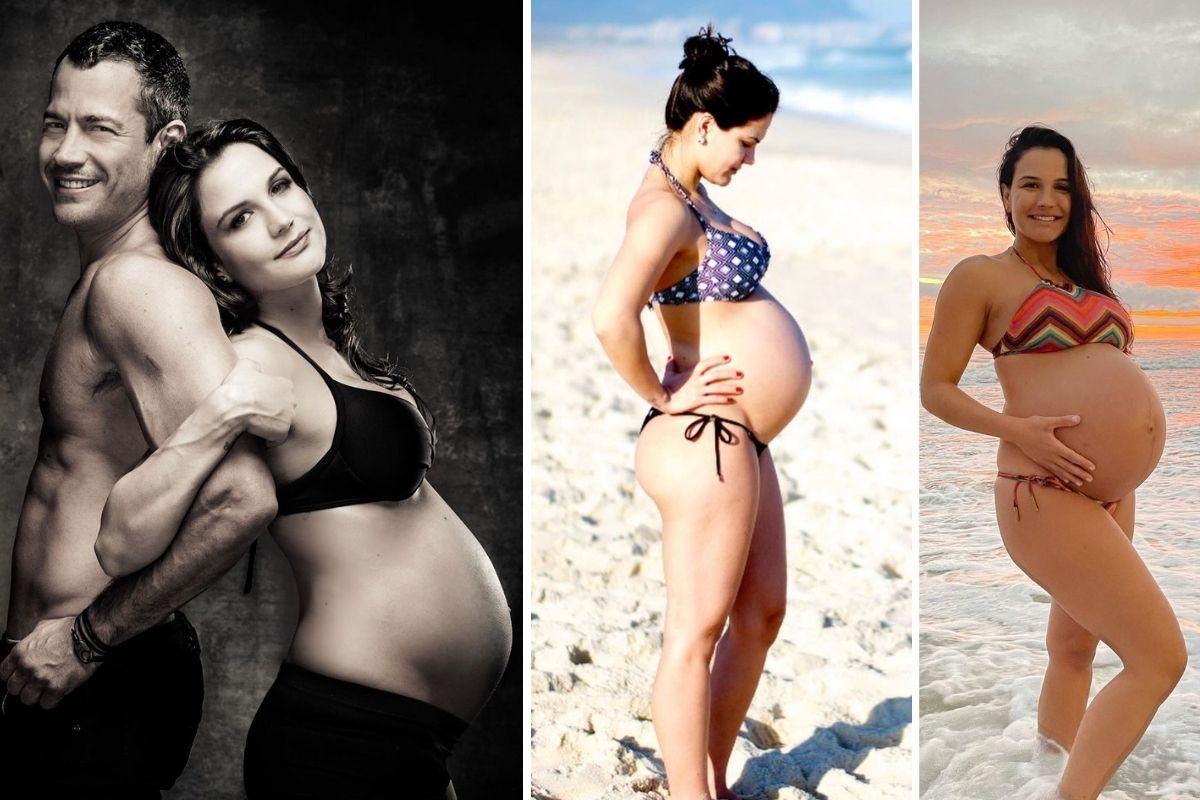 Na primeira foto, Kyra aparece com Malvino Salvador num ensaio com a barriga de fora. Nas outras duas imagens, ela está na praia e de biquíni – de azul na gestação de Kyara e de roupa de banho laranja com pôr-do-sol ao fundo na última gestação, de Rayan.