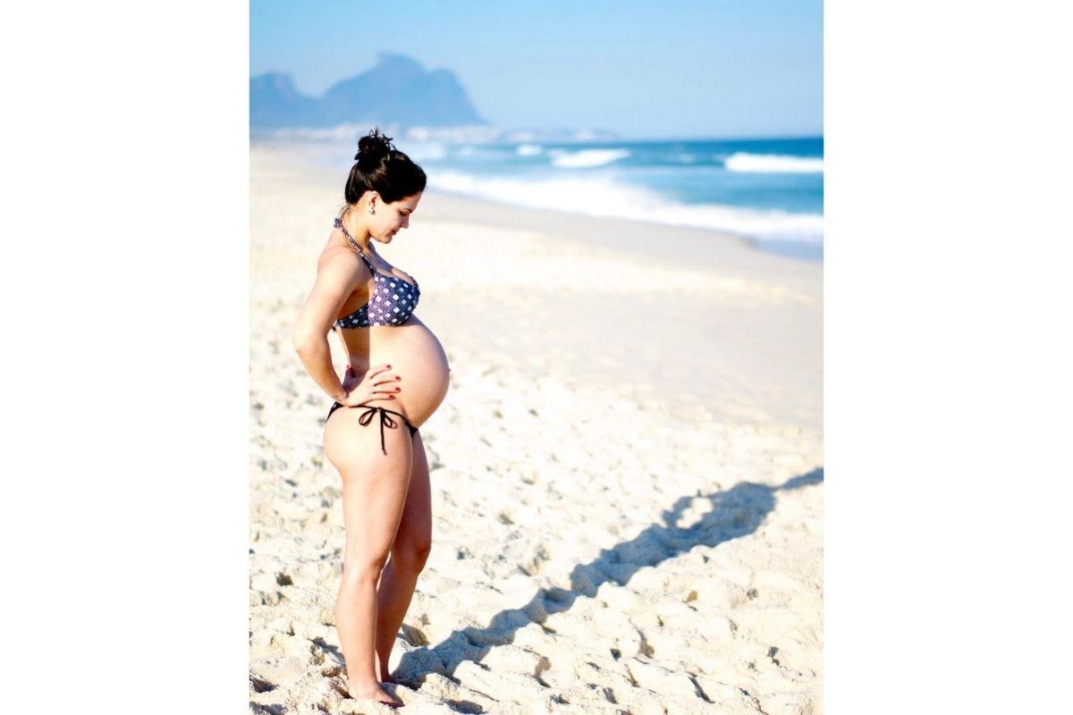Na primeira foto, Kyra aparece com Malvino Salvador num ensaio com a barriga de fora. Nas outras duas imagens, ela está na praia e de biquíni – de azul na gestação de Kyara e de roupa de banho laranja com pôr-do-sol ao fundo na última gestação, de Rayan.