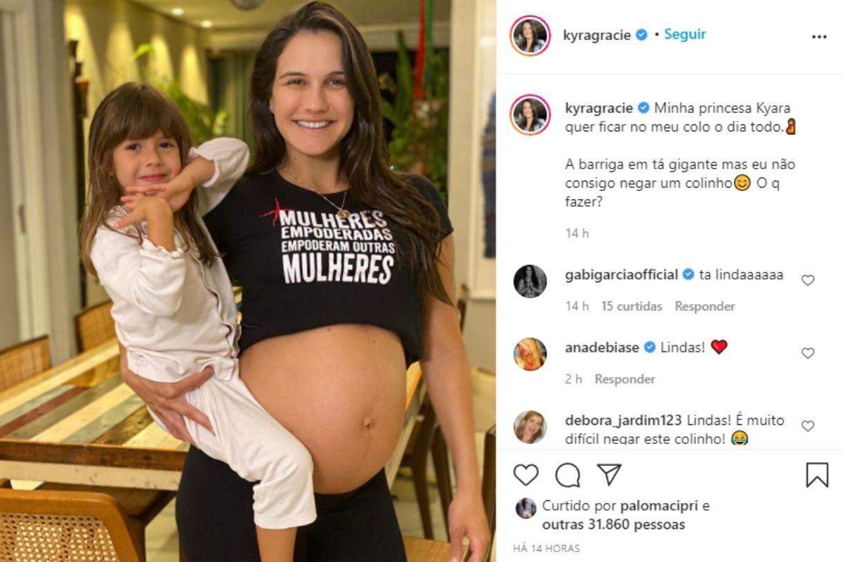 Kyra, que já está na reta final da gravidez, encantou os seguidores ao exibir o barrigão. “Minha princesa Kyara quer ficar no meu colo o dia todo, mas a minha barriga está gigante. Mas como negar um colinho?”, se declarou na legenda da publicação.