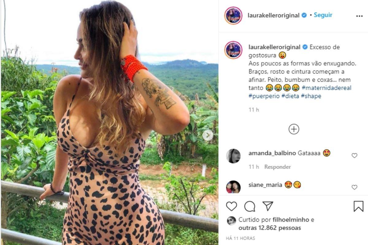 Na imagem publicada no Instagram, Laura Keller posa com um macacão de animal print. “Excesso de gostosura. Aos poucos as formas vão enxugando. Braços, rosto e cintura começam a afinar. Peito, bumbum e coxas… nem tanto”, escreveu ela na legenda.