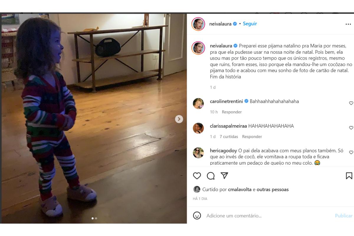 Foi através do Instagram que Laura Neiva compartilhou o relato hilário. Para acompanhar a história, ela publicou duas fotos de Maria com o pijama de Natal, antes que o desastre acontecesse enfim. Para ver este conteúdo, clique aqui!