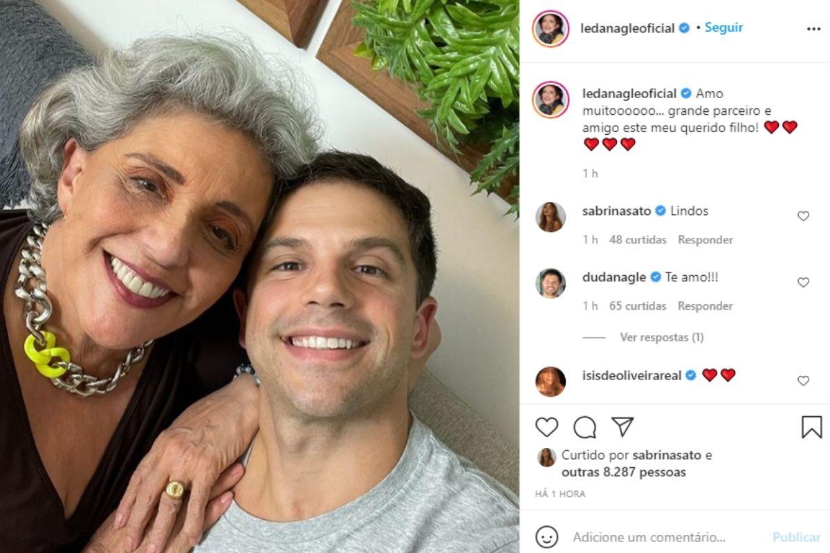 Leda Nagle aproveitou a quinta-feira, 11 de março, para deixar uma mensagem de carinho para o filho, Duda. A jornalista publicou nas redes sociais uma foto onde mãe e filho aparecem lado a lado e se declarou para o ator. Casado com Sabrina Sato, Duda é fruto do casamento de Leda com Rogério Marques.