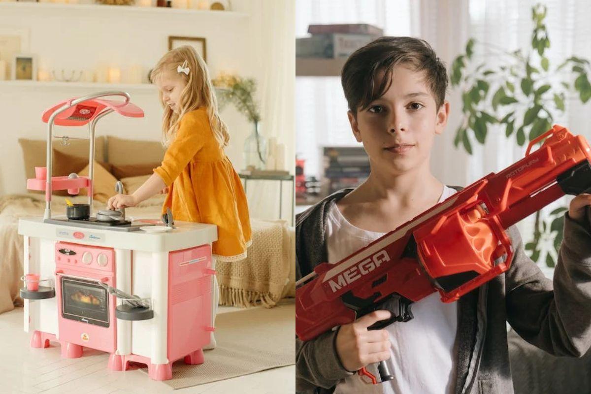 Montagem de menina brincando com a cozinha rosa e o menino aparecendo com uma arma de brinquedo