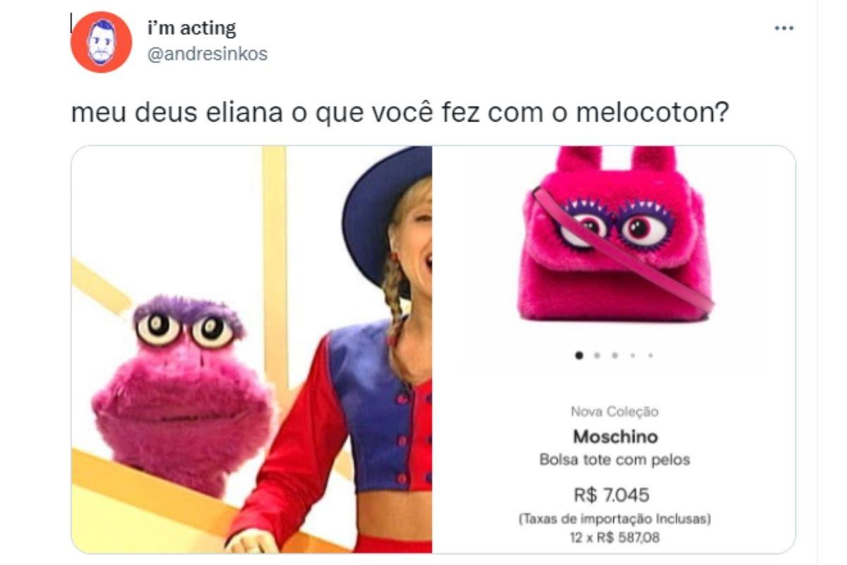 Como assim?! Uma bolsa da grife Moschino, avaliada em R$ 7 mil, viralizou na internet. Contudo, muito mais do que a beleza do produto ou até mesmo o preço, os internautas se impressionaram com a semelhança do acessório com um personagem muito especial: o Melocoton, companheiro de Eliana no Bom Dia & Cia que participou da infância de muita gente!