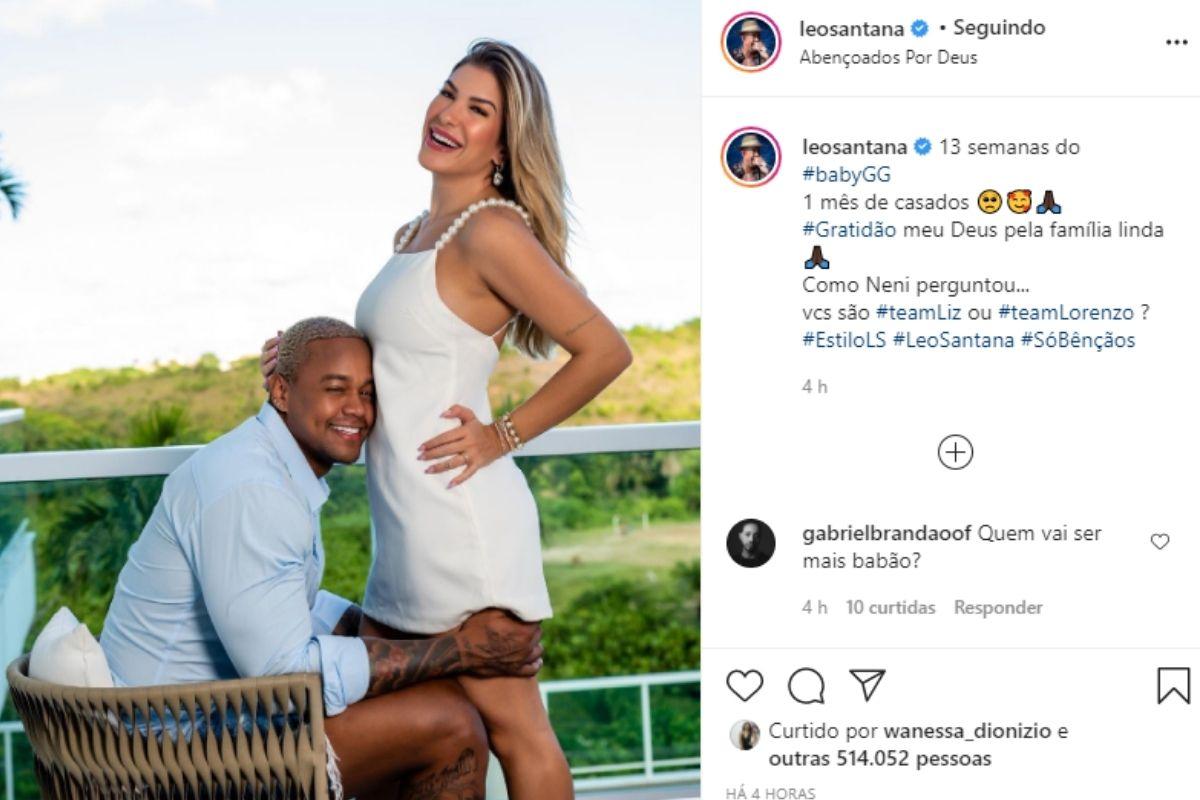 “13 semanas do #babyGG. 1 mês de casados #Gratidão meu Deus pela família linda. Como Neni perguntou… vocês são #teamLiz ou #teamLorenzo ? #EstiloLS #LeoSantana #SóBênçãos”, escreveu ele na legenda da publicação, perguntando aos internautas se eles acham que o bebê é menino ou menina. Leo Santana e Lore Improta publicaram recentemente um vídeo em que falavam um pouco sobre a gravidez. No vídeo, eles contaram que já sabem qual vai ser o nome do bebê, tendo duas opções: uma para menino e outra para menina.
