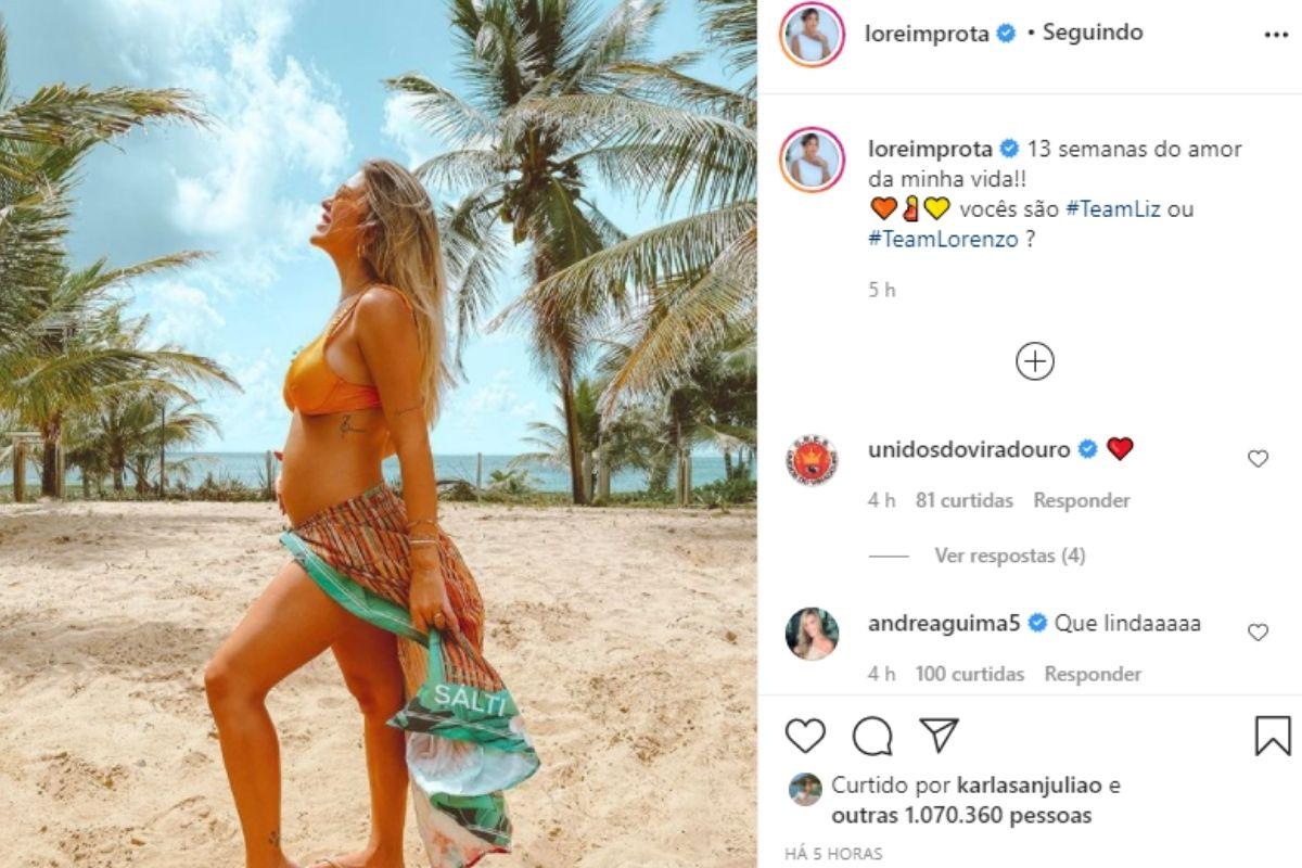 Lore Improta também publicou uma foto para falar sobre a 13° semana da gravidez. Na foto compartilhada por ela, Lore aparece de biquíni em uma praia, mostrando o tamanho da barriga. A famosa também perguntou aos internautas qual vai ser o sexo do bebê. “13 semanas do amor da minha vida. Vocês são #TeamLiz ou #TeamLorenzo?”, escreveu ela ao compartilhar a foto.