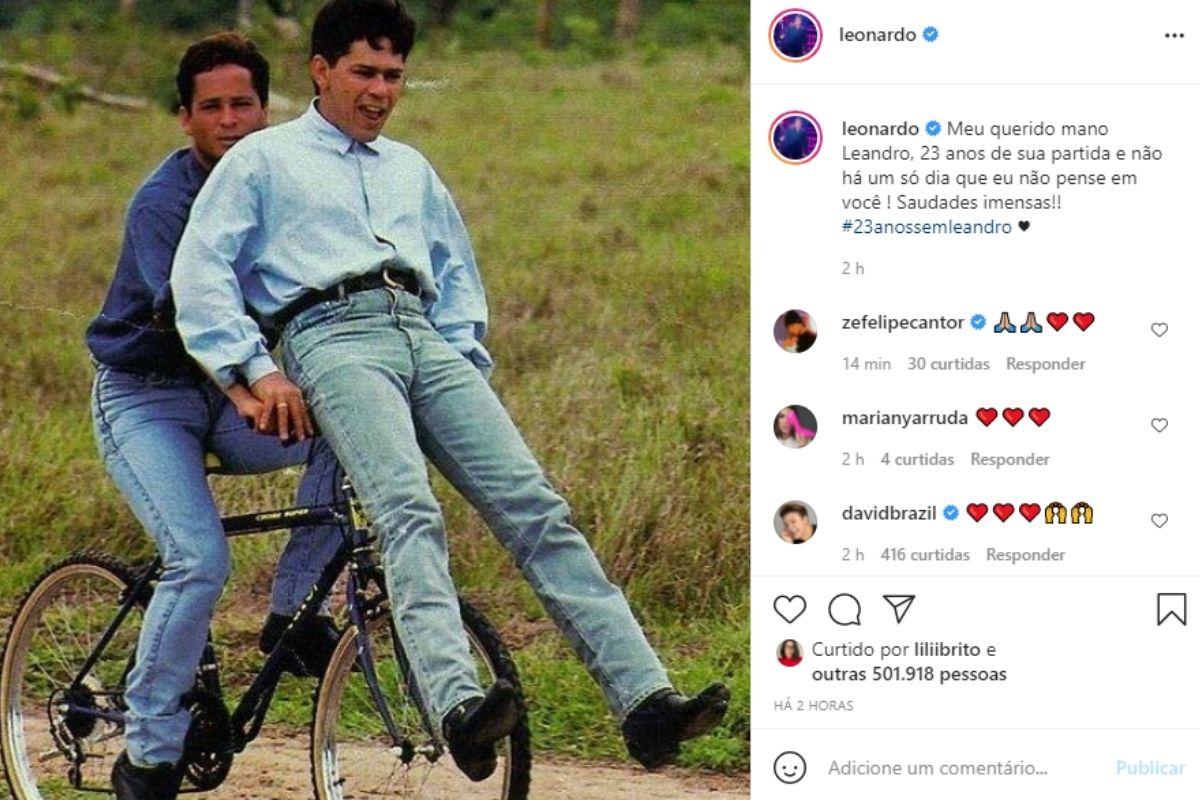 “Meu querido mano Leandro, 23 anos de sua partida e não há um só dia que eu não pense em você ! Saudades imensas!! #23anossemleandro”, escreveu Leonardo na publicação. Na foto, os dois aparecem jovens, andando de bicicleta juntos.