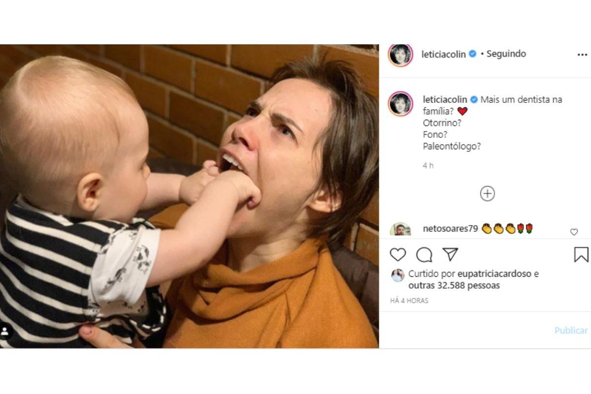 A atriz Letícia Colin usou as redes sociais para publicar um momento super divertido ao lado do filho, Uri, de 9 meses. Na imagem, compartilhada nesta segunda-feira, 24 de agosto, o bebê aparece mexendo na boca da mãe, enquanto ela o segura. “Mais um dentista na família? Otorrino? Fono? Paleontólogo?”, brincou na legenda.
