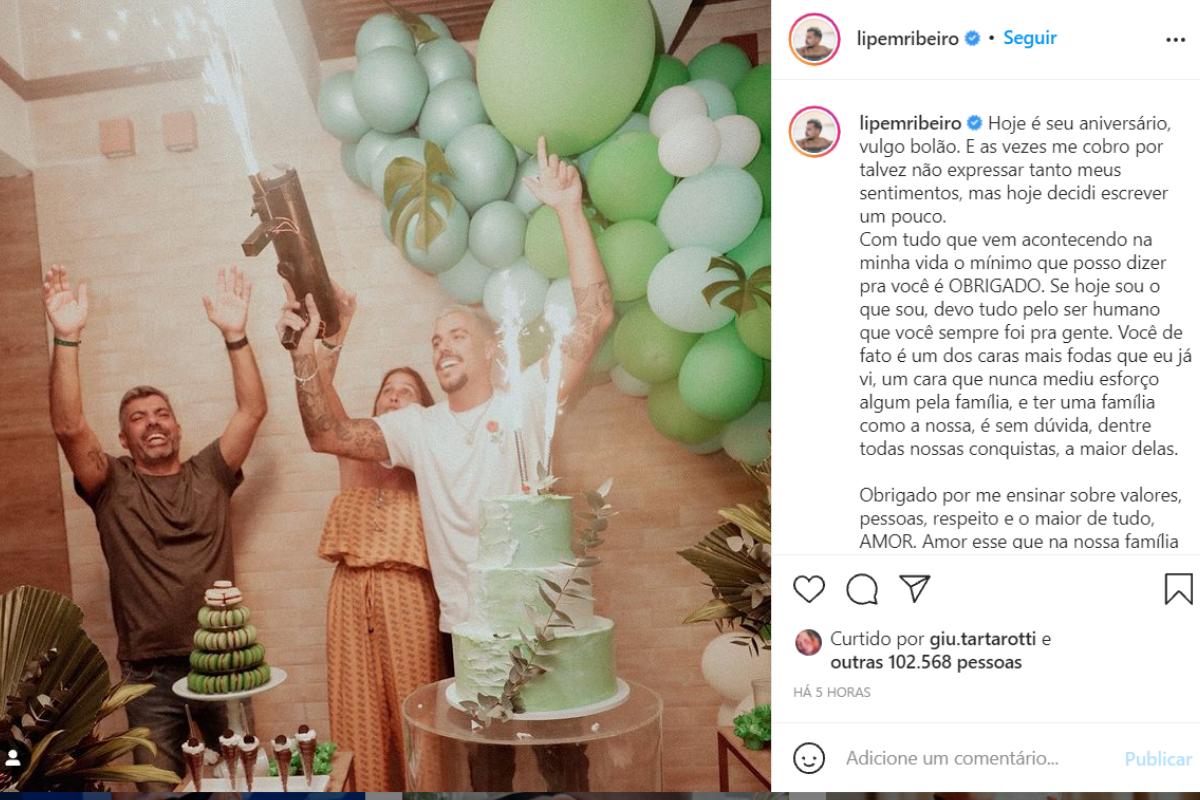 Para homenagear o “Bolão”, apelido carinhoso que Lipe e outros membros da família chamam o pai, o apresentador publicou uma foto comemorando o aniversário do genitor e celebrando em frente a um espaço decorado com balões, bolo e doces. Para conferir esta postagem, clique aqui.