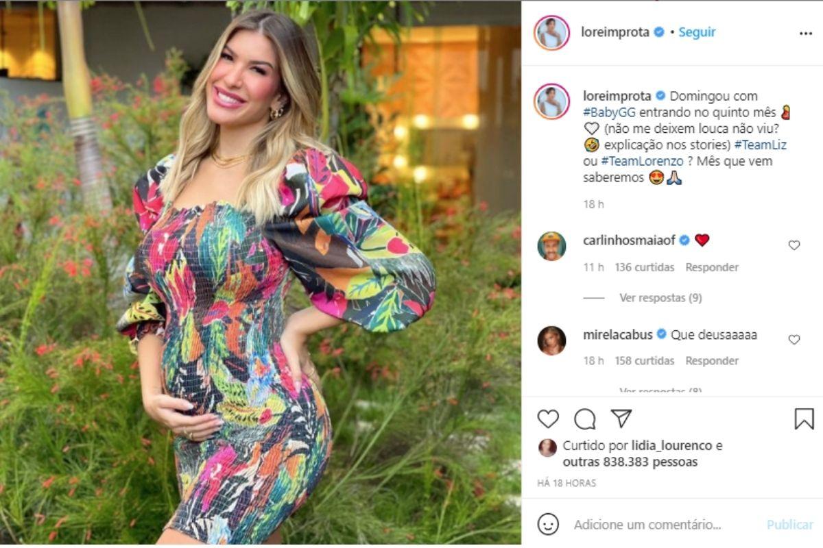 Na imagem, Lore Improta aparece com um vestido colorido bem coladinho para mostrar o barrigão de grávida. “Domingou com #BabyGG entrando no quinto mês (não me deixem louca não viu? explicação nos stories) #TeamLiz ou #TeamLorenzo ? Mês que vem saberemos!”, escreveu na legenda.