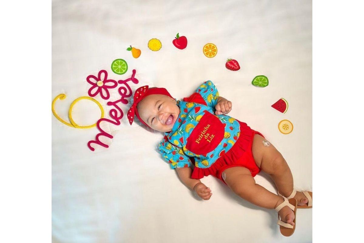 Na foto, a menina está com uma roupa combinando com o cenário, cheio de frutas, para fazer as fotos da data importante. O tema escolhido para este mês foi feira de frutas.