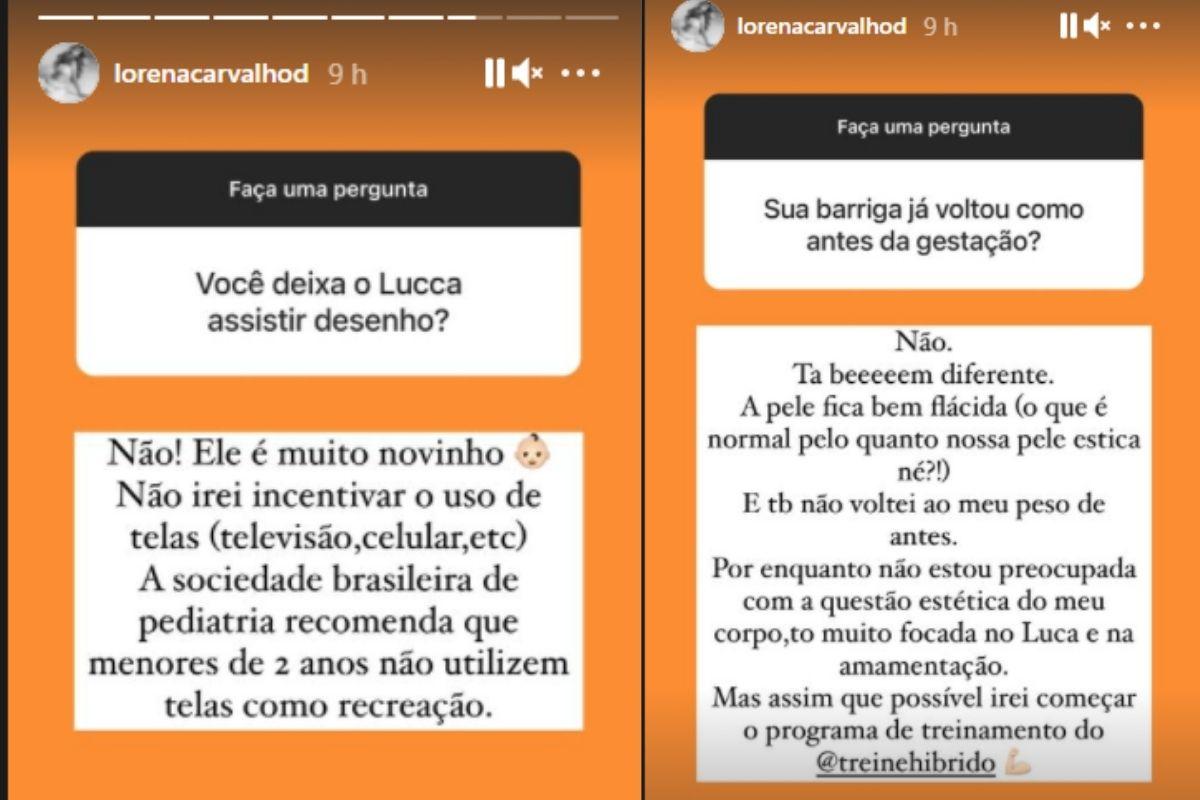 Ainda nos stories, um fã perguntou: “Sua barriga já voltou como antes da gestação?”, e ela respondeu: “Não. Está bem diferente. A pele fica flácida (o que é normal pelo o quanto a nossa pele estica né?). Eu também não voltei ao meu peso de antes. Por enquanto, não estou preocupada com a questão estética do meu corpo. Estou muito focada no Luca e na amamentação”.