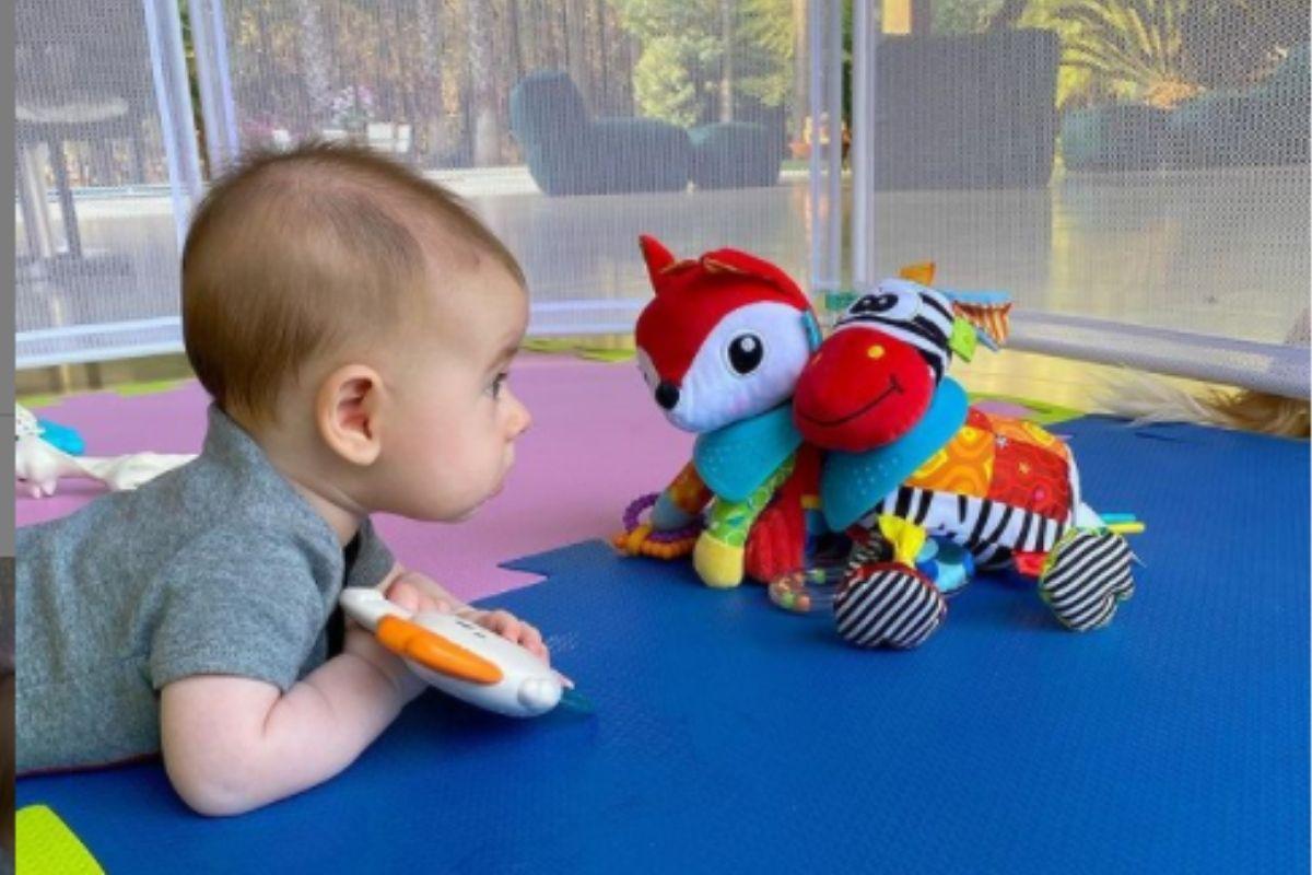 O casal flagrou o herdeiro brincando com bonecos de pelúcia e fizeram questão de registrar o momento. Na imagem, o pequeno aparece encarando os bichinhos. “Hoje brinquei bastante com meus amiguinhos”, escreveram na legenda da publicação feita no Instagram oficial do bebê.