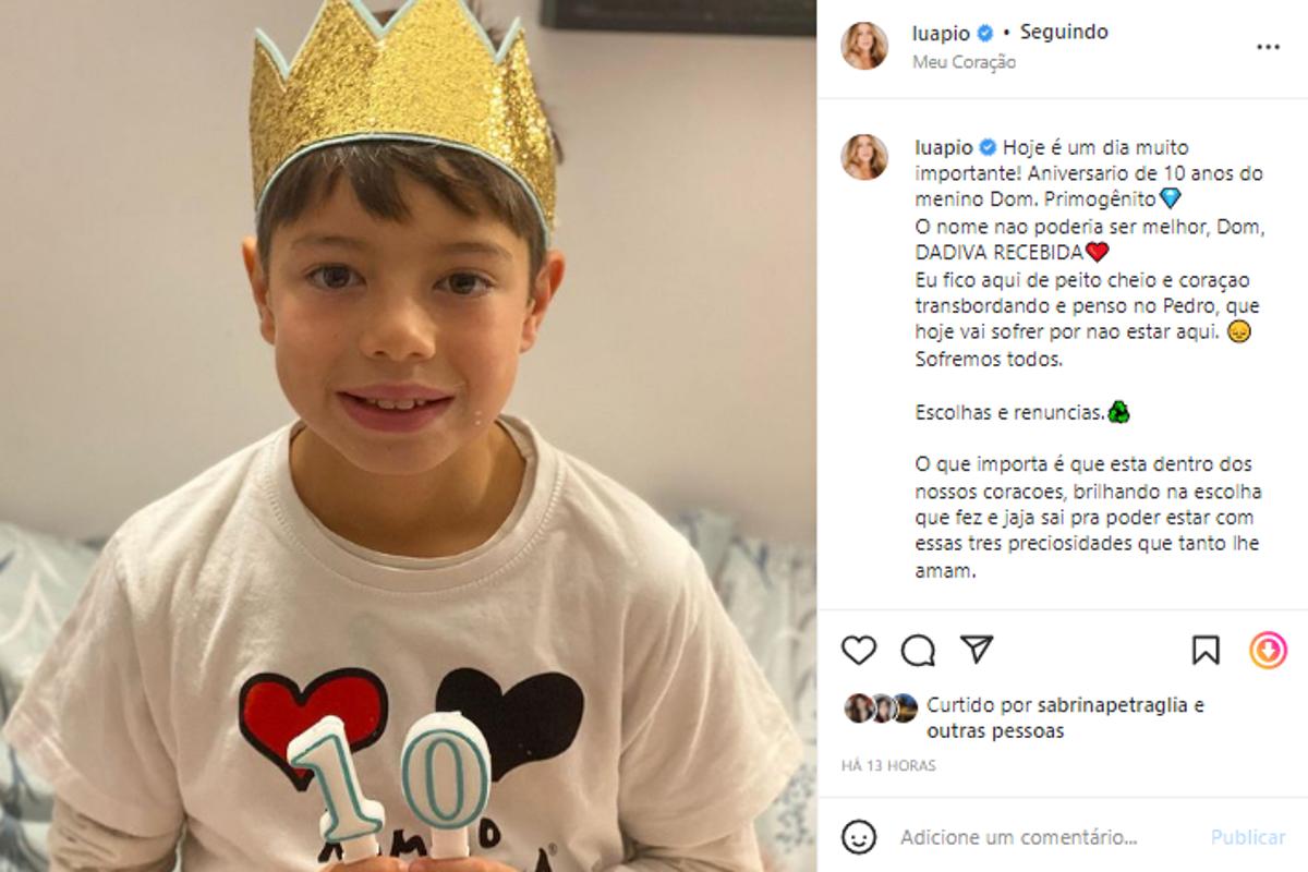 “Hoje é um dia muito importante! Aniversário de 10 anos do menino Dom. Primogênito. O nome não poderia ser melhor, Dom, dádiva recebida. Eu fico aqui de peito cheio e coração transbordando e penso no Pedro, que hoje vai sofrer por não estar aqui. Sofremos todos. Escolhas e renúncias”, escreveu ela na legenda da publicação.