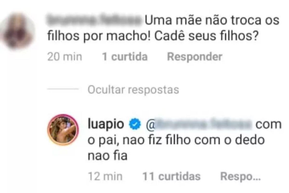 O post logo encheu de comentários, incluindo o da internauta que decidiu criticar a forma na qual Luana cuida dos filhos. “Uma mãe não troca os filhos por macho. Cadê seus filhos?”, questionou a seguidora. “Com o pai. Não fiz filho com o dedo não, ‘fia’”, rebateu a atriz, se referindo a Scooby, que está com as crianças no Brasil, enquanto Luana está em Portugal. Veja o comentário abaixo: