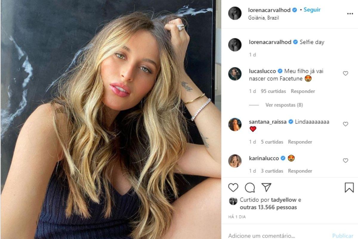 Nesta quinta-feira, 12 de novembro, Lorena Carvalho, que está no 5º mês da gestação usou o Instagram para compartilhar um foto fazendo carão e recebeu um elogio do marido, Lucas Lucco que está super empolgado com a paternidade.