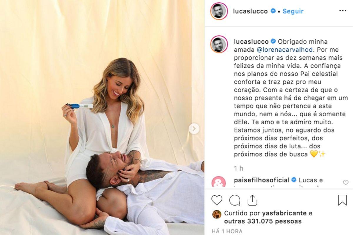 O anúncio de que Lorena teria perdido o bebê também foi feito no dia 3 de outubro e deixou todo mundo desolado. Lucas escreveu um texto agradecendo a força e o amor de Lorena. Olha só: ”