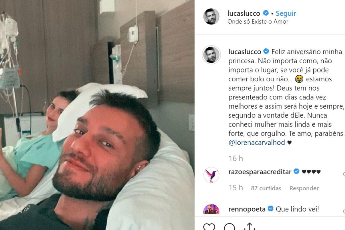 Ele publicou uma selfie e mostra que está deitado em uma cama de hospital fazendo companhia para a futura esposa. Na legenda, Lucas abriu o coração e emocionou os seguidores. “Feliz aniversário minha princesa. Não importa como, não importa o lugar, se você já pode comer bolo ou não… 😂 estamos sempre juntos! Deus tem nos presenteado com dias cada vez melhores e assim será hoje e sempre, segundo a vontade dEle. Nunca conheci mulher mais linda e mais forte, que orgulho. Te amo, parabéns”.