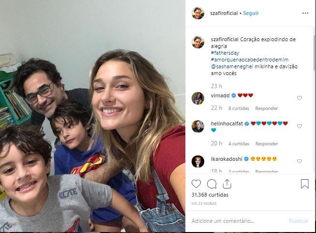 Luciano Szafir curtiu muito o Dia dos Pais ao lado dos filhos. No domingo, 11 de agosto, o ator publicou uma foto rara com a filha mais velha, Sasha, e com os dois filhos, Mikael e David. Na legenda da publicação, Szafir declarou: “Coração explodindo de alegria. Amor que não cabe dentro de mim, Sasha, Mikinha e Davizão, amo vocês”.