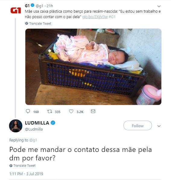 Na quarta-feira, 3 de julho, a cantora Ludmilla se comoveu com uma história enquanto lia as notícias do dia. No Twitter, ela leu uma reportagem no G1 que falava sobre uma mãe que usou uma caixa plástica como berço para a filha recém-nascida.