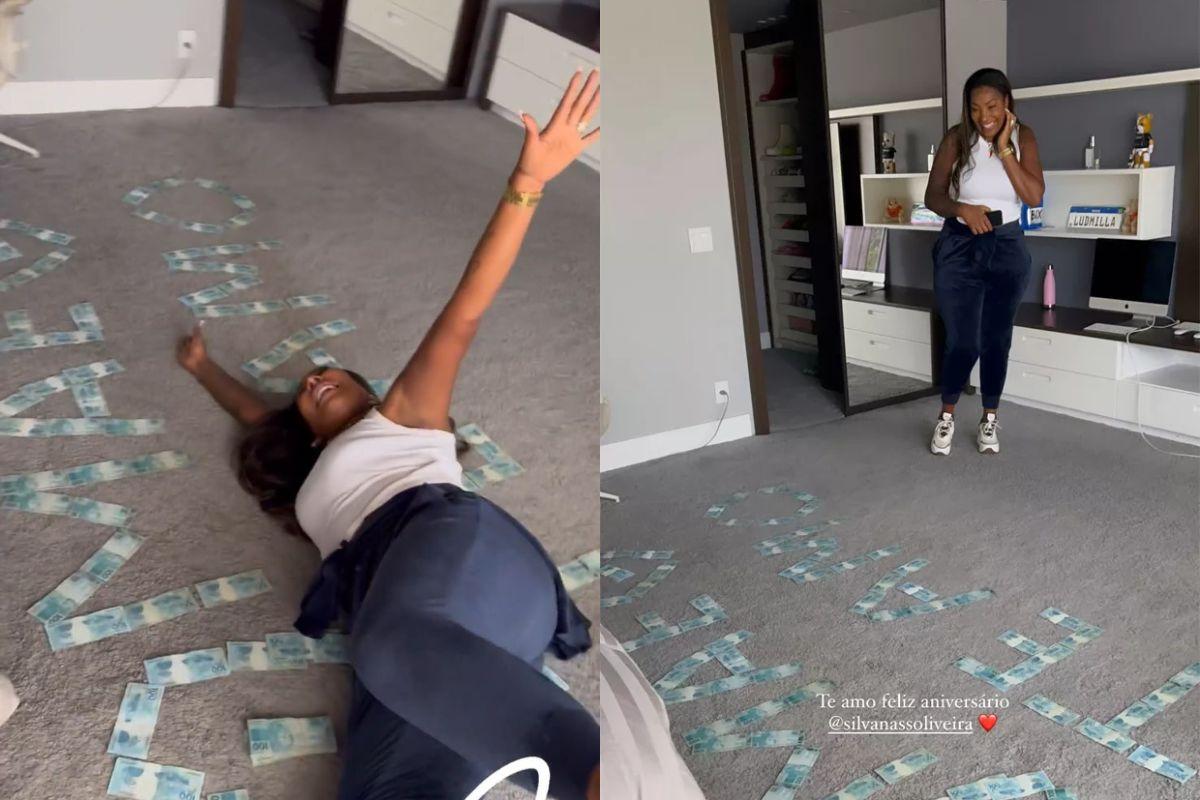 A mãe da compositora não poupou exagero ao reagir ao presente da filha. Com muito entusiasmo, Silvana não parava de sorrir nas publicações e se jogou no chão em cima das cédulas de R$100 para revelar sua felicidade com a surpresa de Ludmilla. “Olha os bolinhos espalhados”, Ludmilla comentou contente ao ver a reação de Silvana.