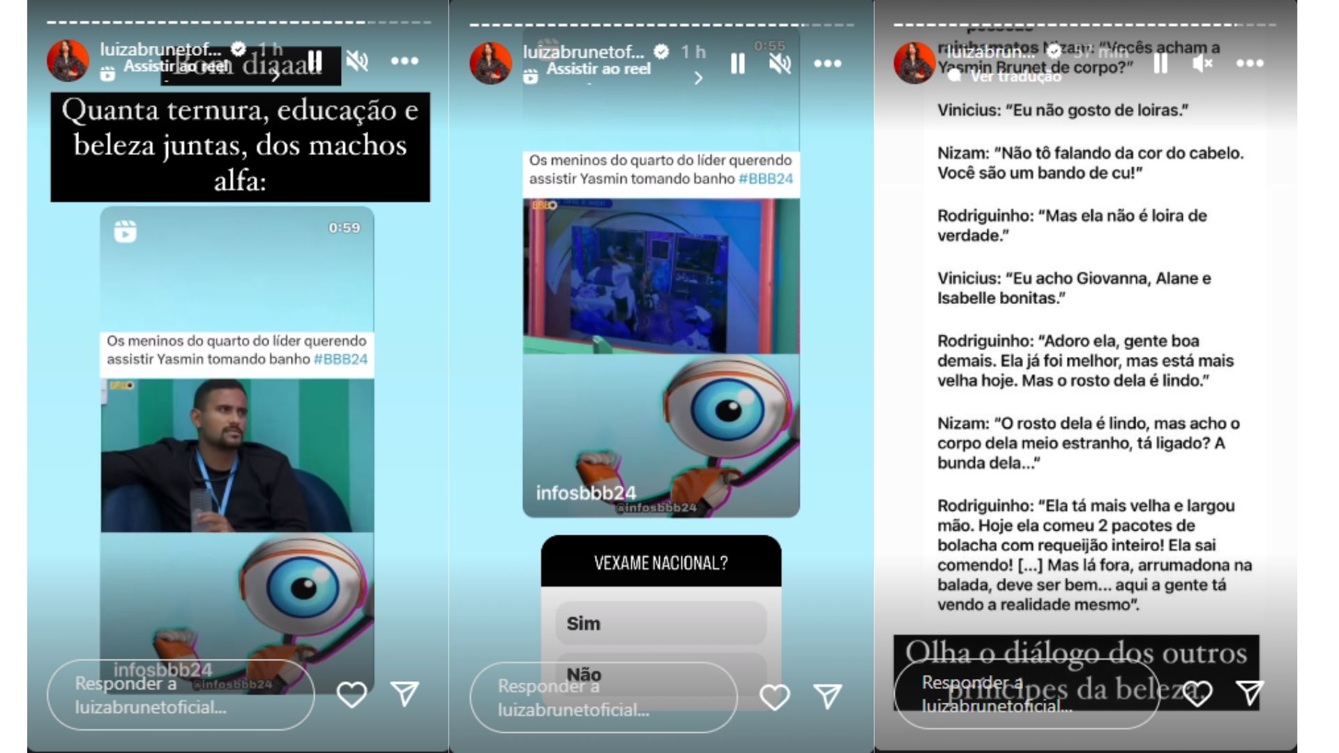 Luiza também compartilhou o vídeo que mostra Rodriguinho, Nizam, Lucas Pizane e Vinicius dando a entender que queriam usar as câmeras do quarto do líder para ver Yasmin tomar banho e escreveu: “Quanta ternura, educação e beleza juntas, dos machos alfa”. Na sequência, ela fez uma enquete: Vexame nacional? Sim ou não.