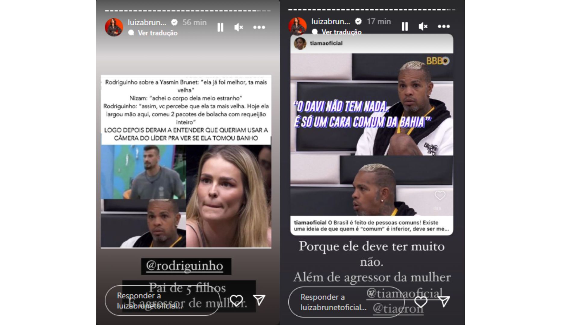 “Rodriguinho: pai de 5 filhos e agressor de mulher”, escreveu Luiza ao compartilhar uma publicação que menciona o comentário do cantor sobre Yasmin: “Ela já foi melhor, tá mais velha” e “Hoje ela largou mão aqui, comeu 2 pacotes de bolacha com requeijão inteiro”.