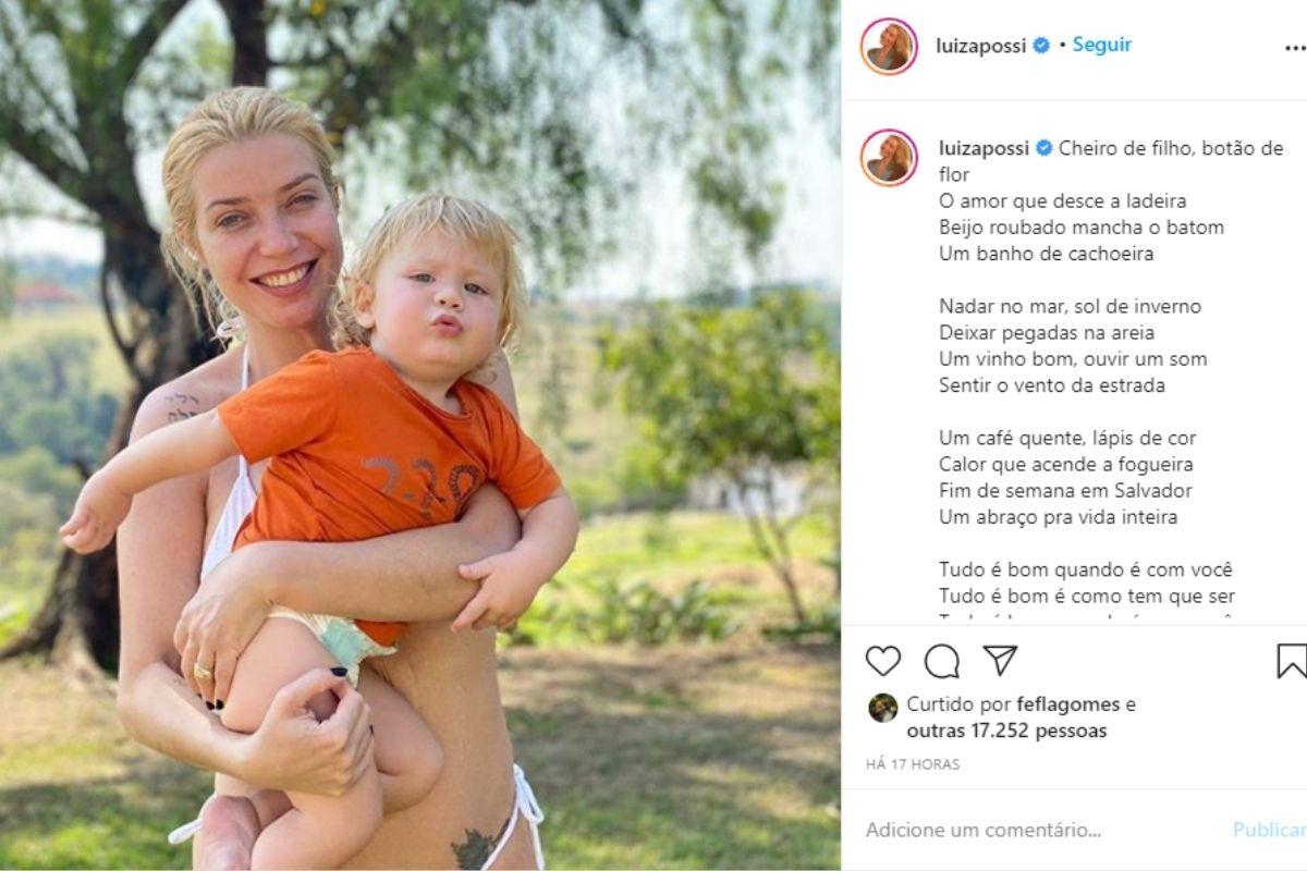 Na imagem ela aparece com o filho no colo e se declarou para o filho na legenda com o trecho da música ‘Cheiro de filho’. A cantora ainda publicou uma série de cliques, alguns onde aparece andando a cavalo, outros com o filho, Lucca e mais alguns apenas do pequeno se divertindo na piscina.