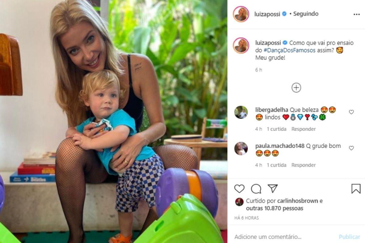 A cantora Luiza Possi usou as redes sociais nesta quarta-feira, 30 de setembro, para compartilhar uma foto cheia de amor ao lado do filho, Lucca. Na imagem, a famosa, que está participando da atual edição da Dança dos Famosos, no Domingão do Faustão, fez uma declaração para o filho e brincou que não conseguiria ensaiar com a criança por perto.