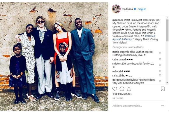 “Pelo que sou mais AGRADECIDA no mundo! Meus filhos me levaram por caminhos e abriram portas que eu nunca imaginei atravessar. Fama, fortuna e records de vendas nunca serão mais importantes que este tesouro de maior valor. Feliz Dia de Ação de Graças de Malawi!”, escreveu a cantora na foto com os 6 filhos: Lourdes Maria, Rocco Ritchie, Mercy James, David Banda e as gêmeas Estere e Stelle.