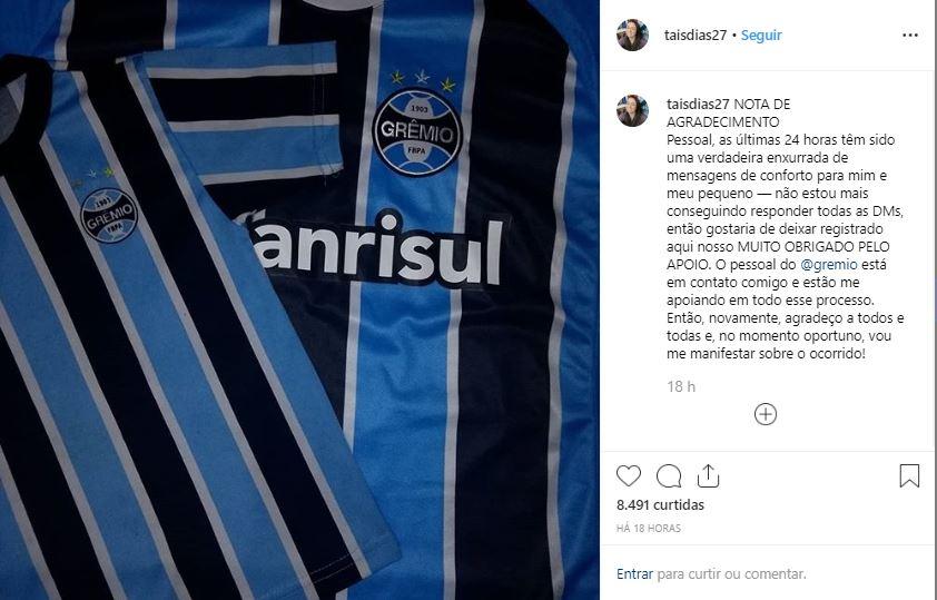 “As últimas 24 horas têm sido uma verdadeira enxurrada de mensagens de conforto para mim e meu pequeno – não estou mais conseguindo responder todas as DMs, então gostaria de deixar registrado aqui nosso muito obrigado pelo apoio. O pessoal do Grêmio está em contato comigo e estão me apoiando em todo esse processo. Então, novamente, agradeço a todos e todas e, no momento oportuno, vou me manifestar sobre o ocorrido”, diz a publicação.