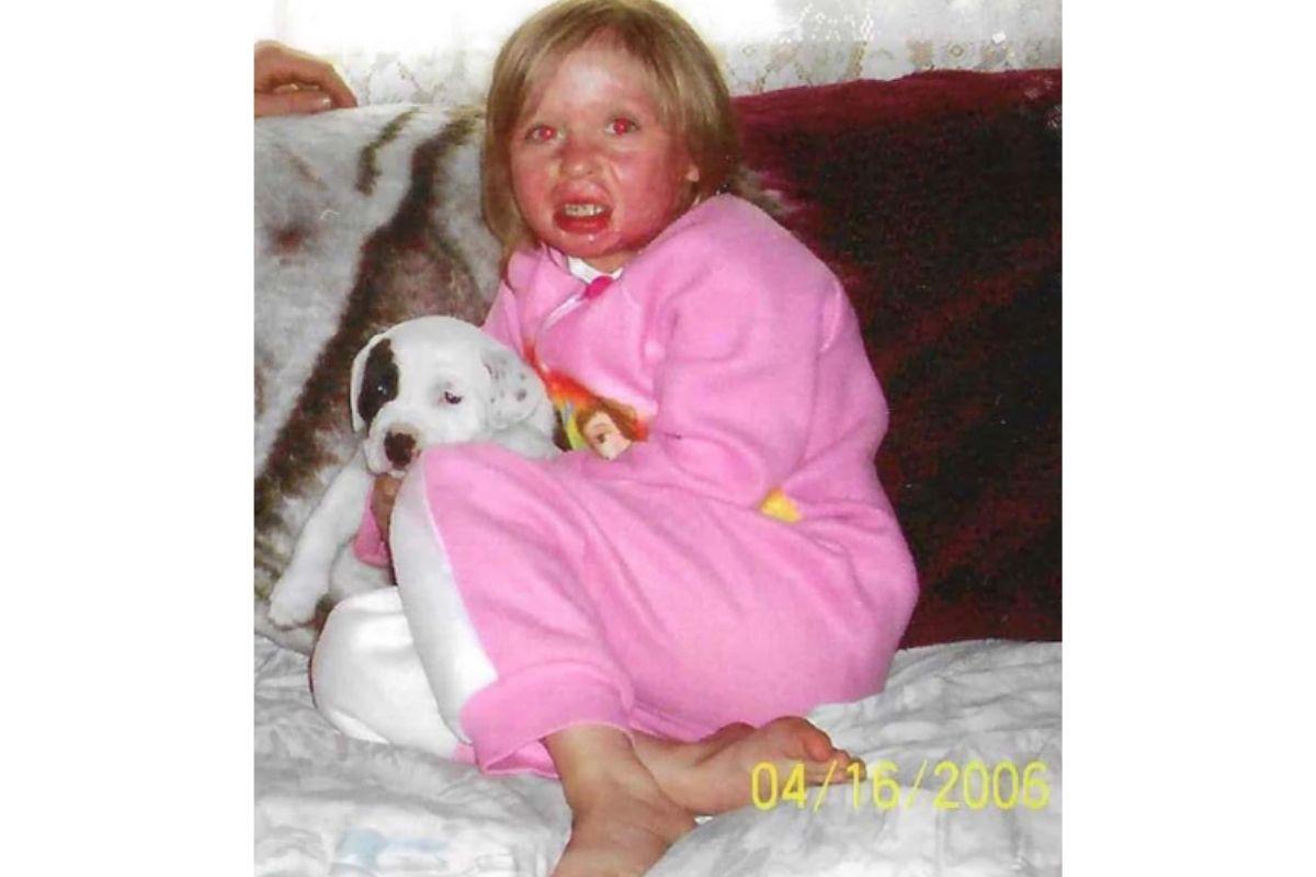 Charity Sutter com o cicatrizes de queimadura de terceiro grau aos 4 anos
